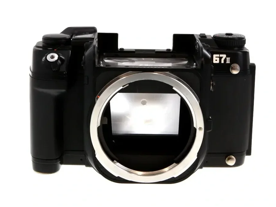 The Pentax 67ii is the newest revision, released in 1998. Itβs specifications are very similar to those of the previous models. The most notable improvement is the built-in right-hand grip, making handling much easier. For those used to the handling of the previous models a left-hand grip can still be added to the body. A dedicated time mode switch (PS TIME) has been added below the mirror up dial. Using time mode on long exposures does not consume as much battery power as bulb mode. The PC terminal for FP (bulb) flash sync is no longer present; it has been replaced with the Pentax speed light 5P connector. On this model an LCD panel located by the film advance lever shows information such as frame counter, film ISO, film load status, battery status, shutter cocking, and flash status. The film back still contains the film format (120/220) window but now has as an emulsion memo holder. The film start mark is now the same for both 120 and 220 film. The 220 format mode can now capture 21exposures compared to the previous 20 exposures. A new self-timer mode is available, located on the same collar as the on/off dial. It has a 12-second delay with an audible beep. Multiple exposure mode is also available. The battery is now 2x CR123A lithium.