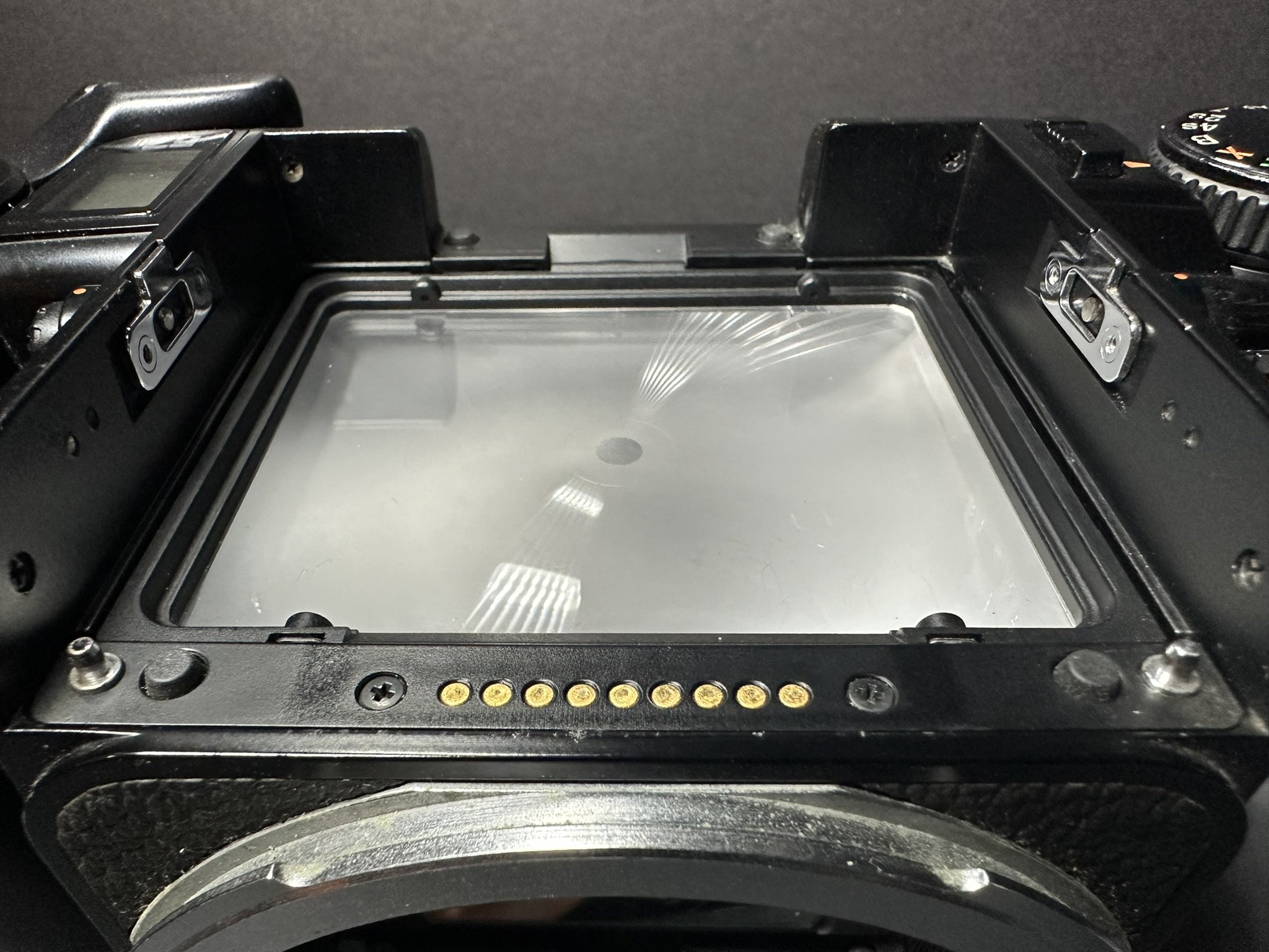 It was also possible to check the shutter with a bypass key that was inserted in the frame counter engagement slot and allow for inspection of the shutter while the film door was open.