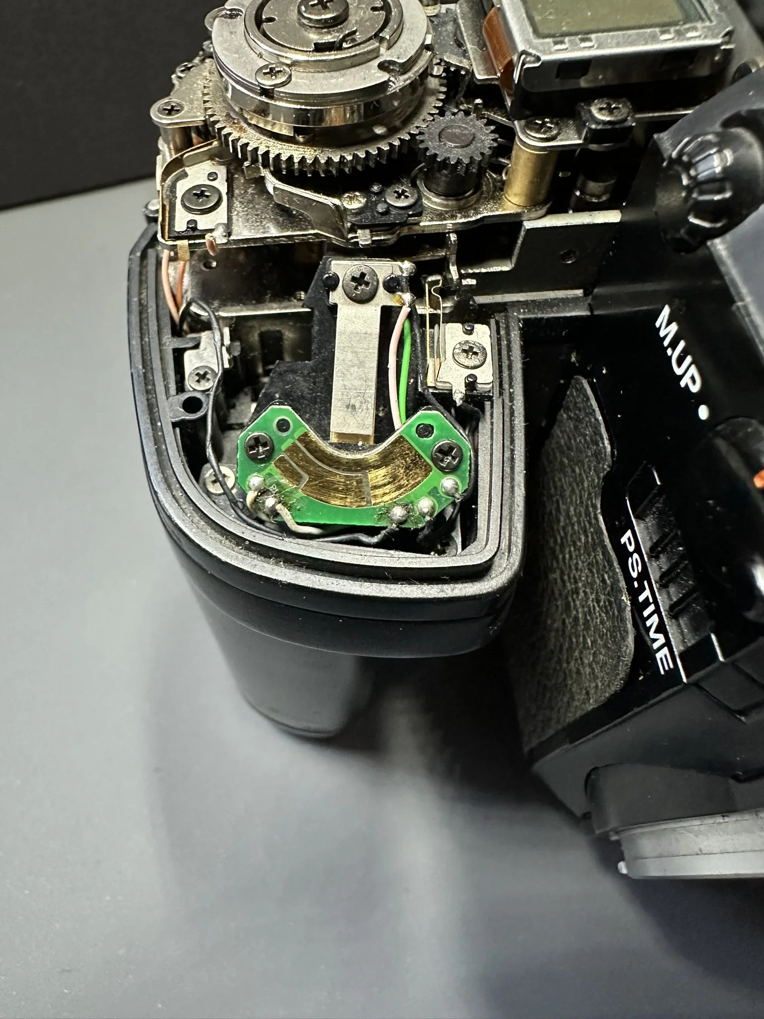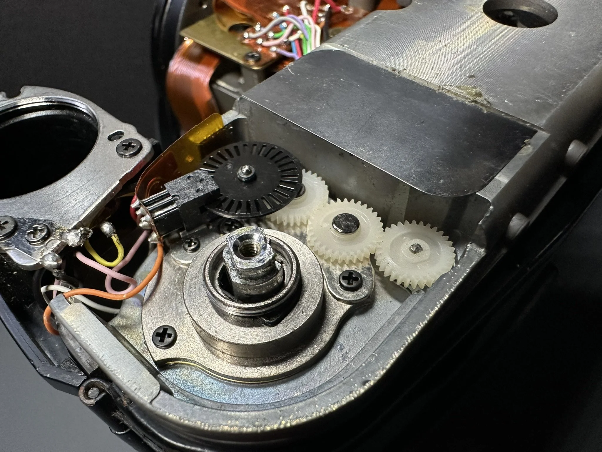 The mirror and cloth curtains are mechanically-driven, the timing of the shutter being electrically governed by transistors and a magnet. The combination of resistors routed by the speed setting determine the length of time the magnet remains engaged.